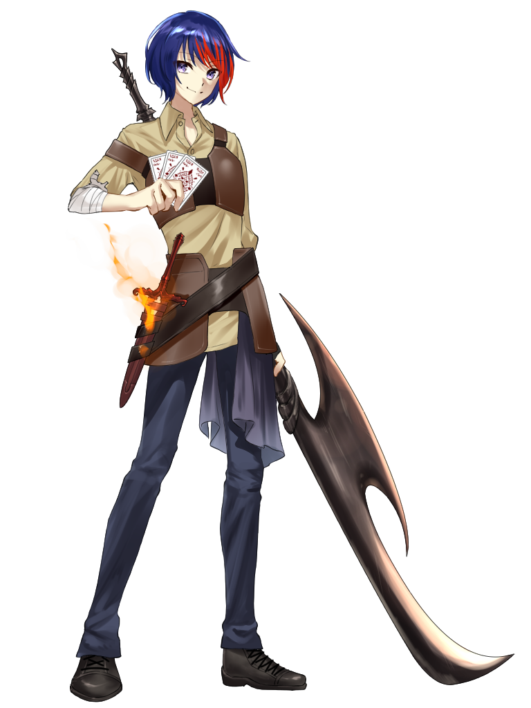 ◆監獄都市ジェイルブルグのスラムで生まれた少年◆広い世界に恋焦がれて命をかけて旅立った◆錆の浮いた鉈を武器として使用◆人を翻弄するようなSっ気がある一方で妙なところで子供っぽい◆様々な世界を巡り、旅をすること自体が生き方◆趣味はオカリナを吹くこと◆外見年齢は10代後半、実年齢はもうチョイ上◆曰く「30年位は生きてたはずです」◆元はバルキリーだが重傷を負いブーステッドとして蘇生した
