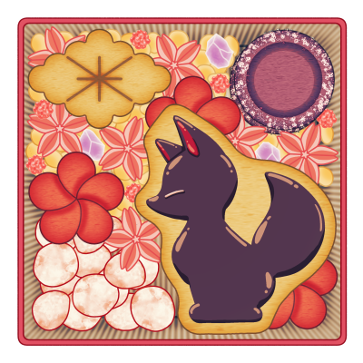 花弁めくフリーズドライ苺の散る、狐のシルエット型チョコパイ。ほんのりラム酒入り。