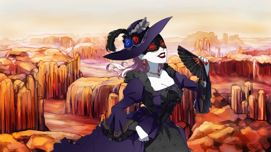 洞窟の中、美しいダイヤモンドの輝きに守られたマダム・シャーロットが黒い扇を手に微笑む。