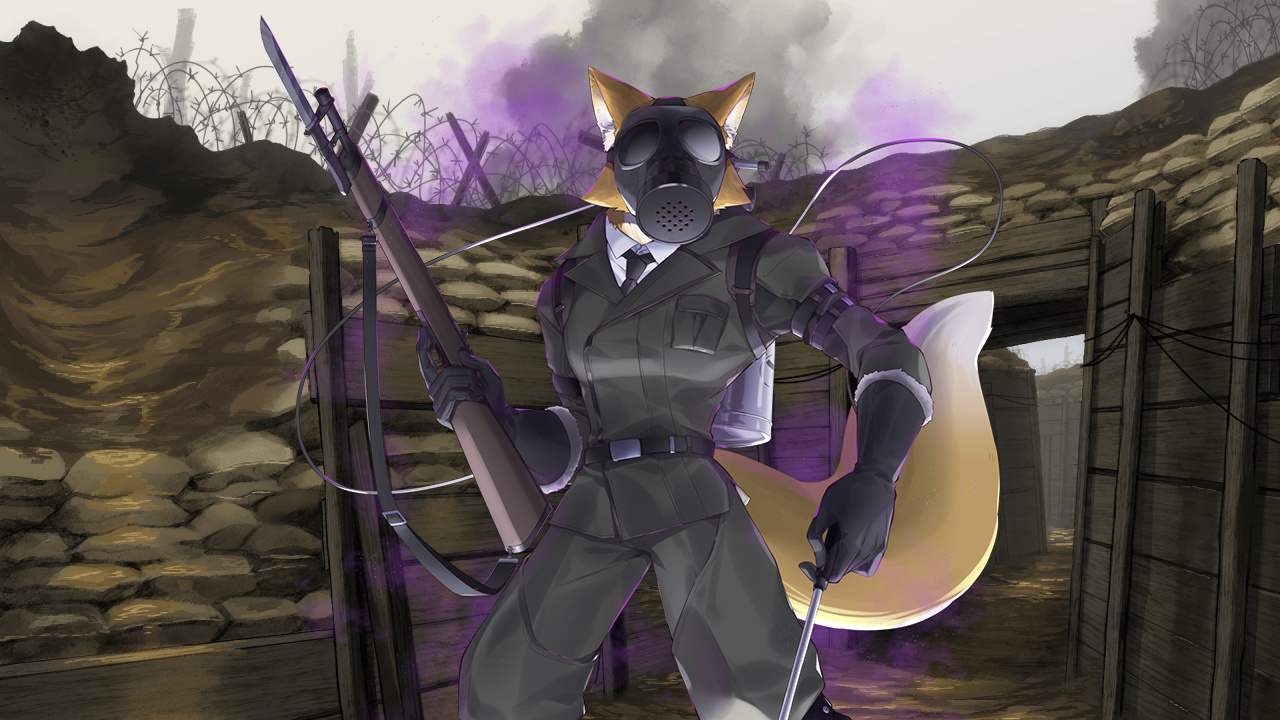 絞められ砕かれ、悲鳴を上げる肉体。ガスマスク兵が一人気を失って倒れた所で、狐火の分身達は次の敵影を目指して駆けていく。