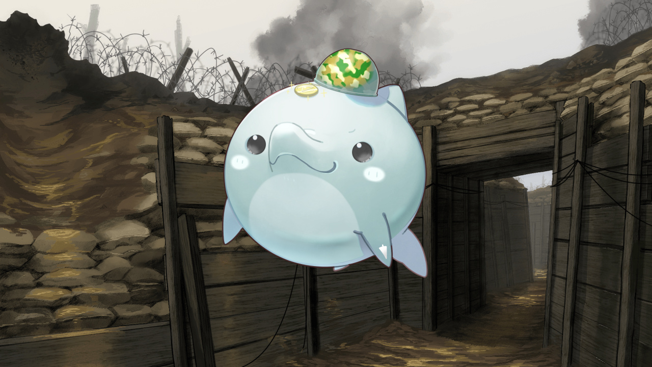 慌てるサイコパスアルブスイルカの耳に届く、ミルナの声。響く方を見上げた視界に映る、空よりも煌めく青。青い髪を靡かせ自身もホエールスプラッシュで舞い上がったミルナが振り下ろした青い刃を持つ斧が、サイコパスアルブスイルカの迷彩ヘルメットを叩き割る。