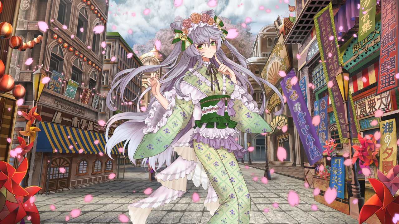 そんなメノンが纏うのは、爽やかなグリーンに紫の花模様、フリルがあしらわれた、パーラーメイド風の浴衣。