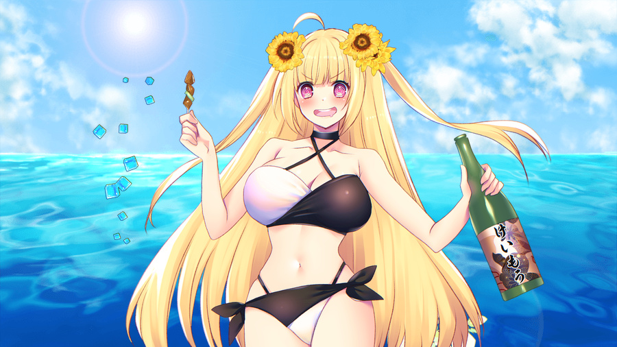 太陽と月の狭間から桃に乗ってやってきた、そんなイメージがお似合いなオマエに喝采が送られる。見た目は麗人、中身は少女とご挨拶にも有る通り、若干の幼さが残るオマエの水着姿はアスリート達にも好評であった。ああ、羽衣に水着とは中々に大胆なコーデだ。しかも、オマエ曰く、これが勝負服も兼ねていると謂う。元気溌溂とした振る舞いはたくさんのジュースを奢られるに相応しい。わーい♪ いただきまーす! ジョッキになみなみと注がれた子供のビールにはちょっとした隠し味が仕込まれている。それは齢16でも摂取可能なカフェインの類であり、これに雰囲気が合わさって酩酊のような状態へと陥る。ばっちり補給できたから、えへへぇ、思いっきり頑張るのじゃー! えっと、ウレタンポカポカアイドルグルグル……? それとも、ウカレポカポカアイドルクラクラ……? まあいいやなんとかなーれ!!! イエーイ! 金色テールをフリフリしつつ不安定なステージへレッツ・ゴーだ。回る前に落ちないよう注意してください。