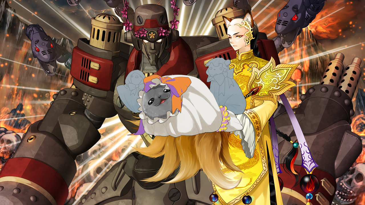 おくるみに囲まれて戸惑う護国鉄神零號。そんな風景を観察しながら、妖狐七星将『破軍』は頭を片手で押さえるのだった。