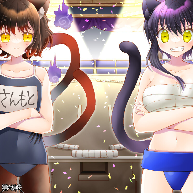 そして土俵の反対側に居るのは陽環・柳火(突撃爆砕火の玉キャット・f28629)だ。彼女もまわし姿で上はサラシを巻いている。